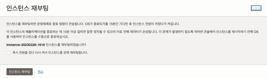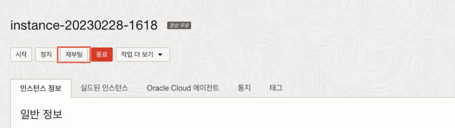 클라우드 콘솔에서 인스턴스 정보 페이지에 있는 재부팅 버튼으로 재시작을 해줍니다.