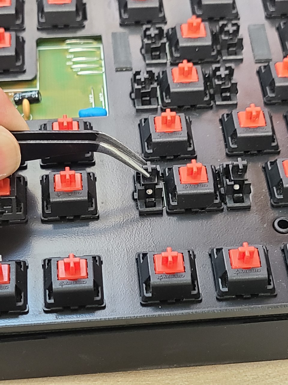 현재 보강판과 기판이 스위치 남땜으로 결합이 되어있는 상태 이기 때문에 스테빌을 분리해서 꼼꼼하게 윤활을 해줄수가 없어서 간이로 구리스를 짜넣는 식으로 작업을 하려고 합니다. 키캡과 결합부분을 살짝 들어주면 스테빌이 보이기 때문에 그 사이로 작업하겠습니다.